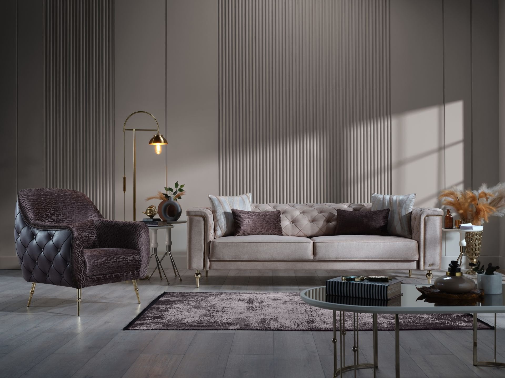 Blanca Koltuk Takımı, etkileyici tasarımı ve lüks detayları ile evinize zarafet ve modernlik katıyor. Vizon renginin asaleti, altın ayak rengiyle mükemmel bir uyum yakalayarak, yaşam alanınıza sofistike bir hava sunuyor. Bu koltuk takımı, dörtlü, üçlü, ikili ve berjer üniteleriyle tam bir oturma deneyimi sunuyor.