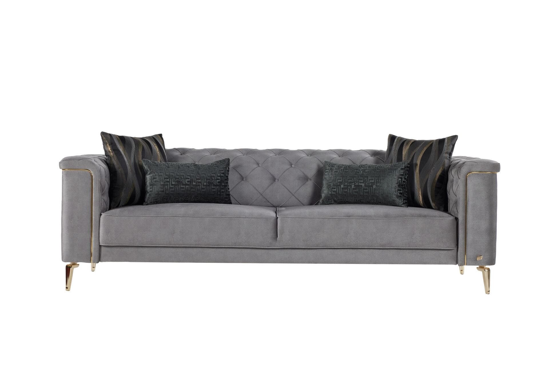 Blanca Üçlü Koltuk, modern görünümüyle şıklığı ve konforu bir araya getirerek tarz sahibi kullanıcılar için ideal bir tercih sunuyor. Gri ve antrasit renklerin incelikle işlendiği bu koltuk takımı, altın rengi ayakları ve koltuk yanındaki çizgileriyle estetik bir bütünlük sağlıyor. Altın detaylarıyla zenginleşen tasarım, oturma odasına sofistike bir atmosfer katıyor.
